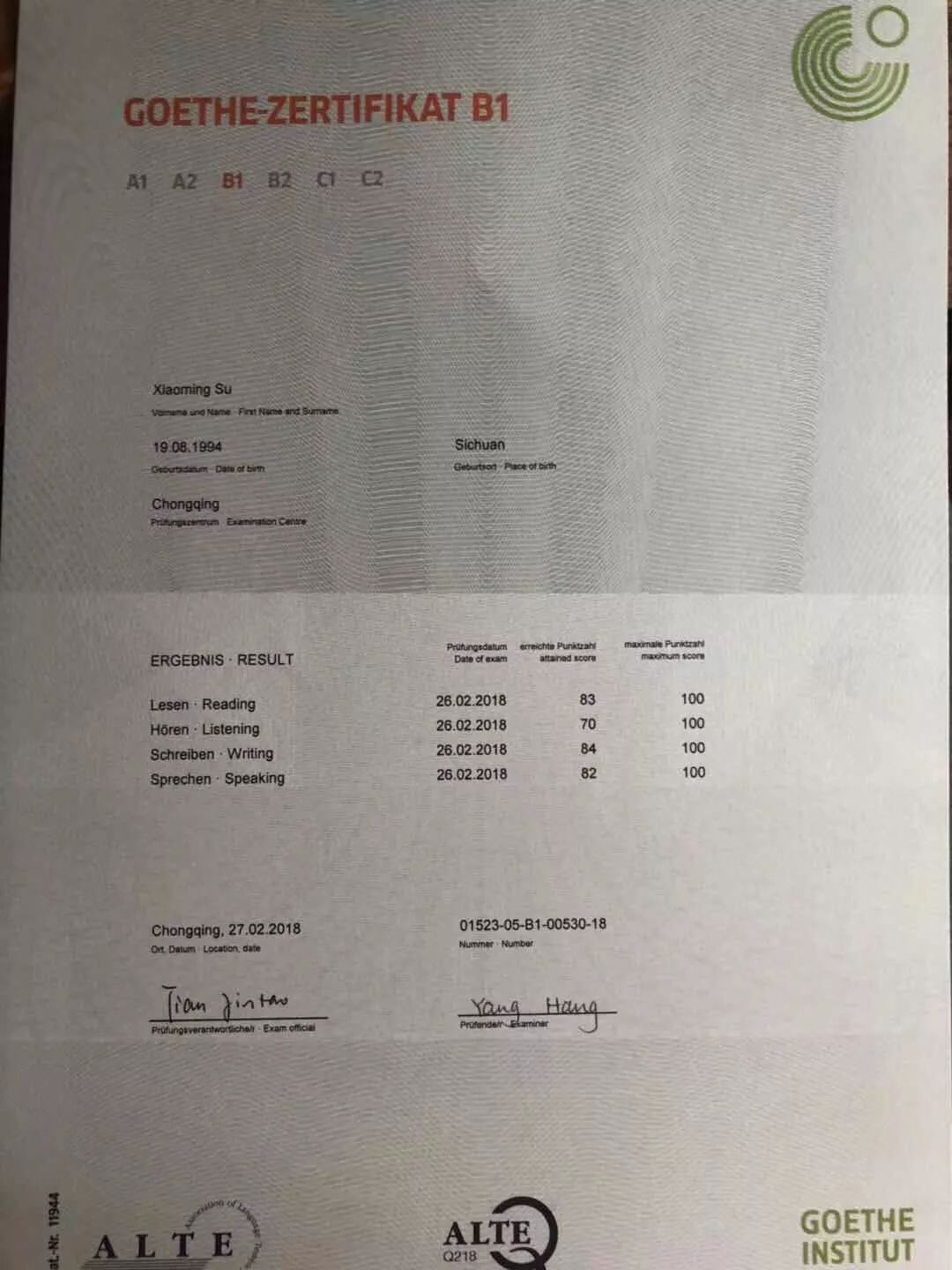 德语欧标考试,相信对所有德语学习的同学来说都不陌生,一些想要去德国留学的同学,不仅仅需要拿到德福证书,还需要去歌德学院考取德国大学要求的相应欧标语言证书,辰品外语•莱茵春天成都德语中心的苏同学,经过5个月的德语培训,一举拿下德语B1证书!